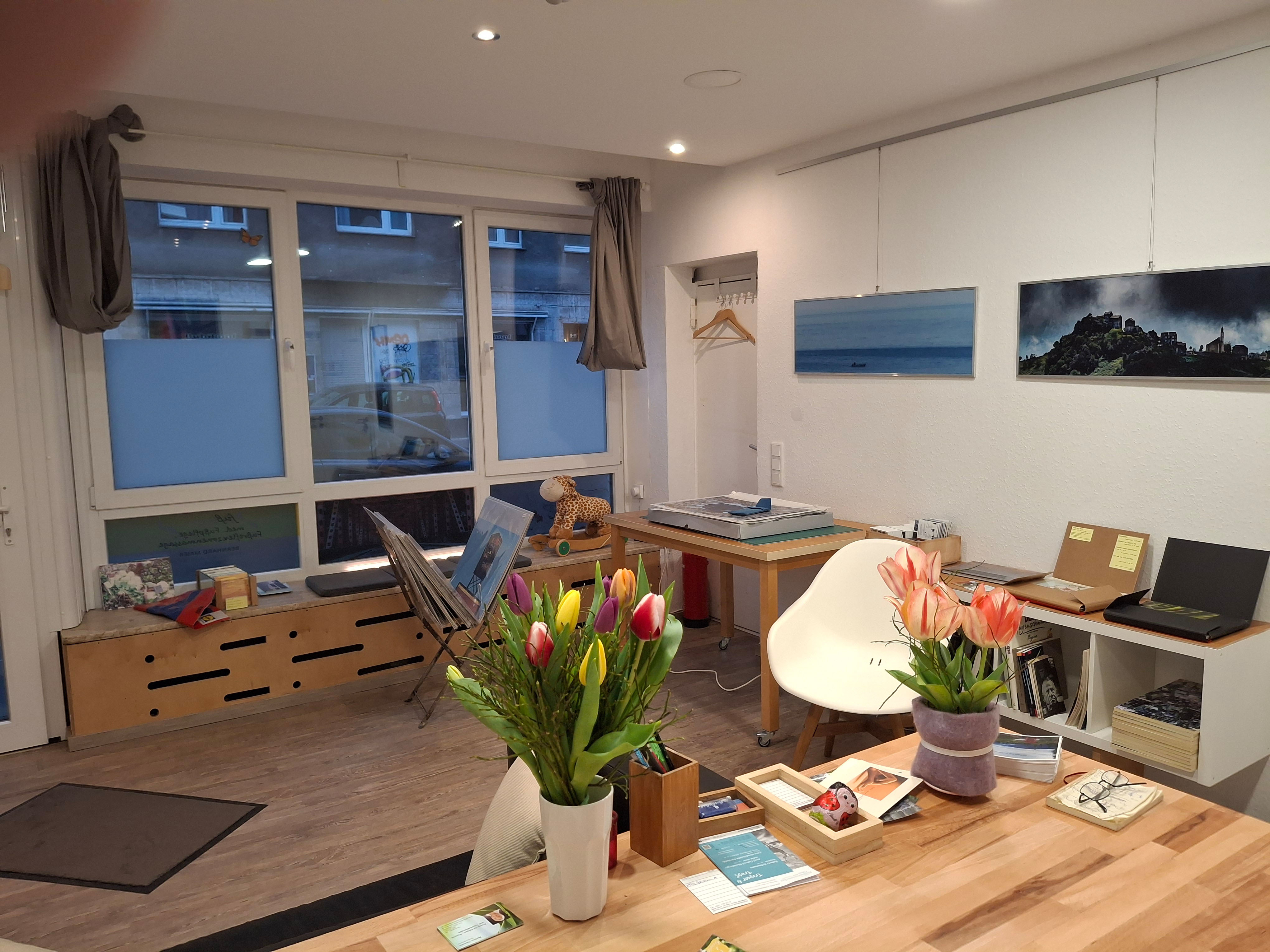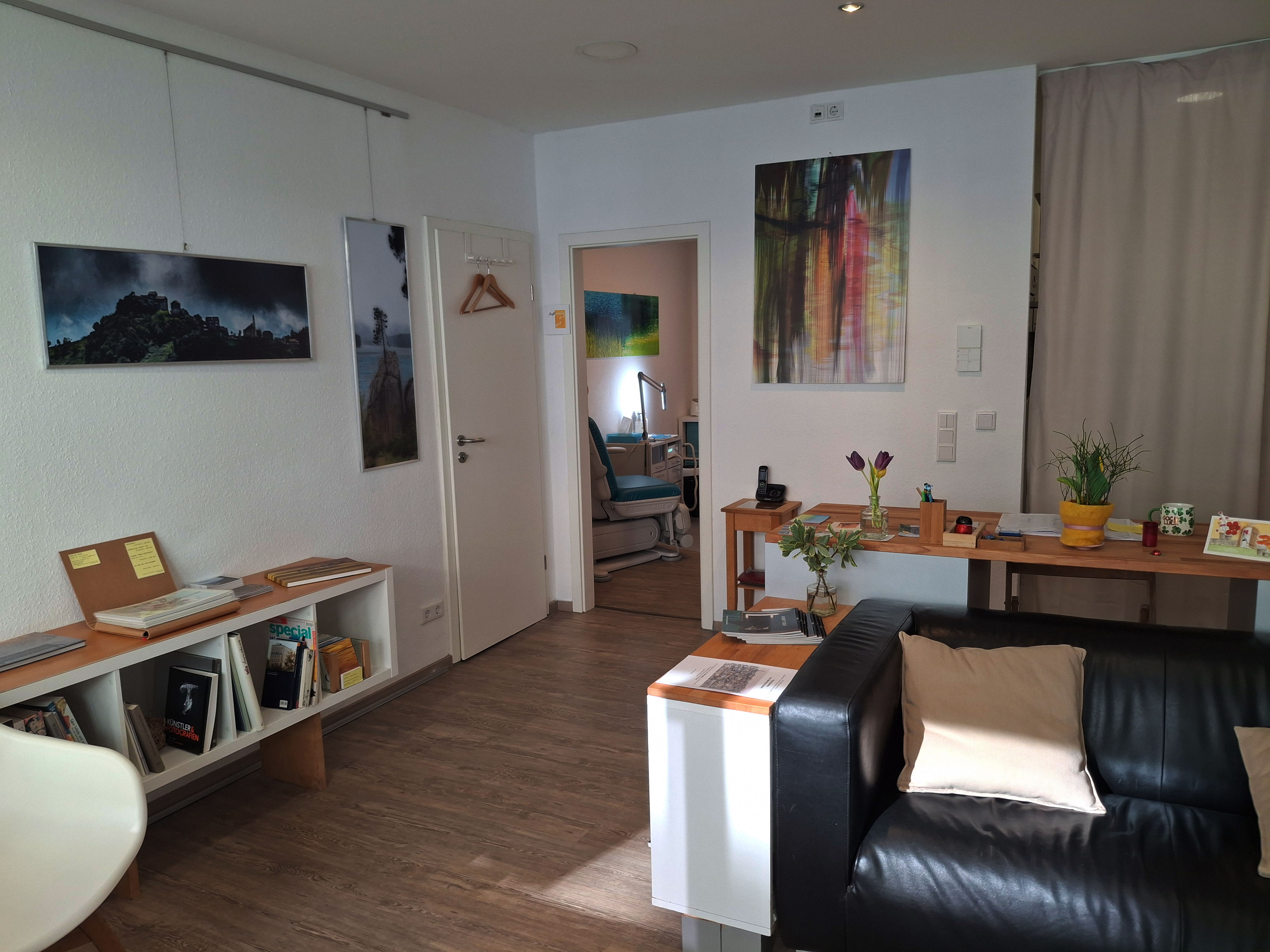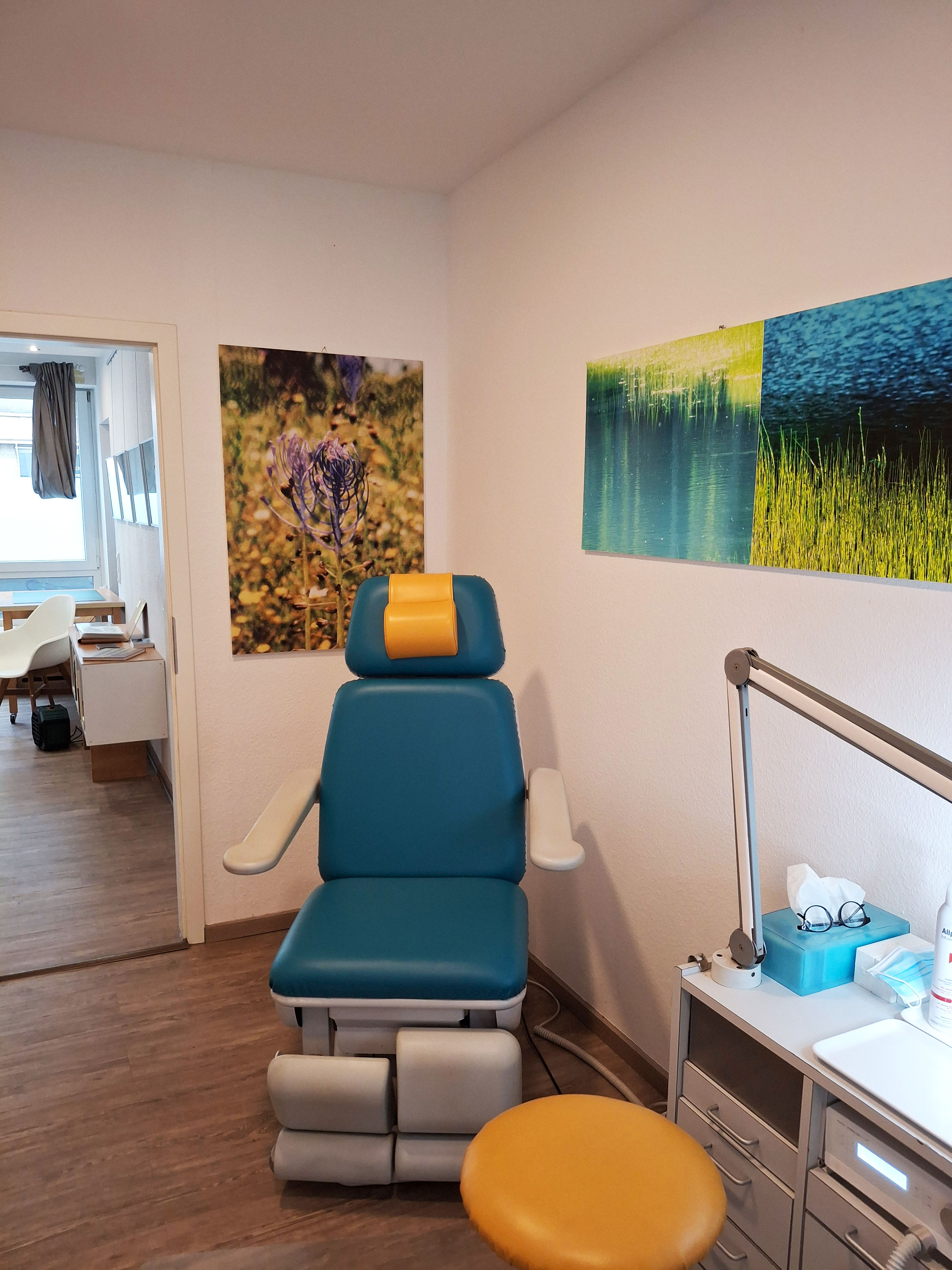 Ihren Füßen die Aufmerksamkeit schenken, die sie verdienen. Wohlfühlen im Behandlungsraum, der gleichzeitig als Kunstraum genutzt wird.
